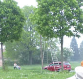 hin und her flitzenden schwarzen Punkten (Bienen) wogt in Baumeshöhe über